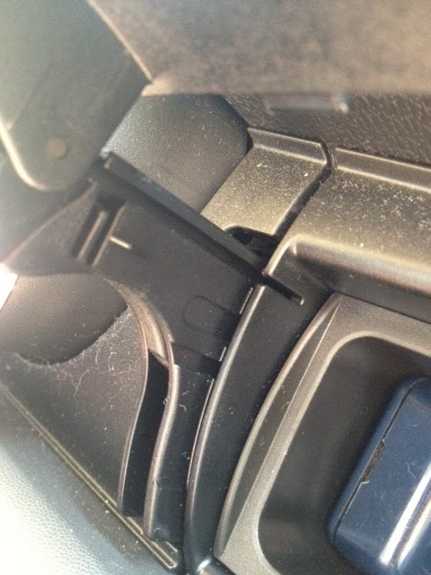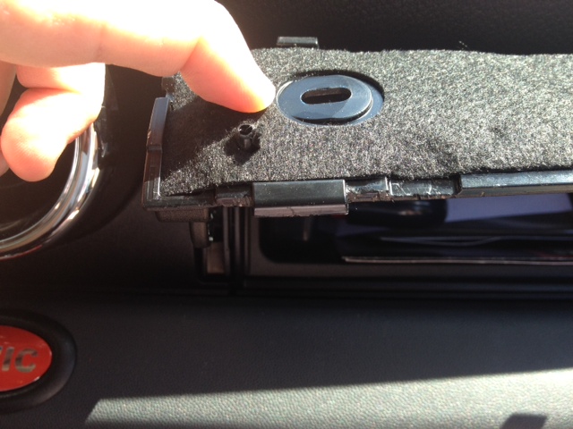 There is one immediately adjacent to the drivers side screw, one where my finger is, and one more in the middle. You sort of have to twist it so that the door moves toward you, and then pull it up and over the tab. It takes a bit of doing, but it does come off. Then you push it toward the dashboard, and it will lift off of the back tabs. Then your hinge looks like this:
