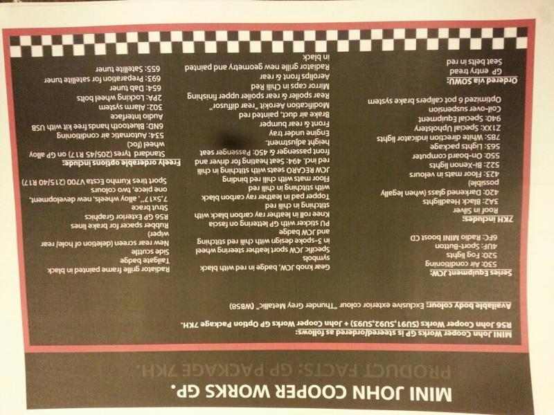 Took my 2011 JCW in for service yesterday and got a couple of tidbits of info about my upcoming GP2 order (although maybe nothing really unexpected.)