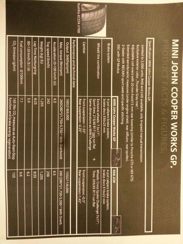Almost seems like a rip off, I mean if you look at the camber settings compared to the JCW, of course one can get better lap times on a track with that set up. Also check out the tires, they use non-run flats for the GP while the JCW still uses RF's. They even run slightly wider wheels and tires.