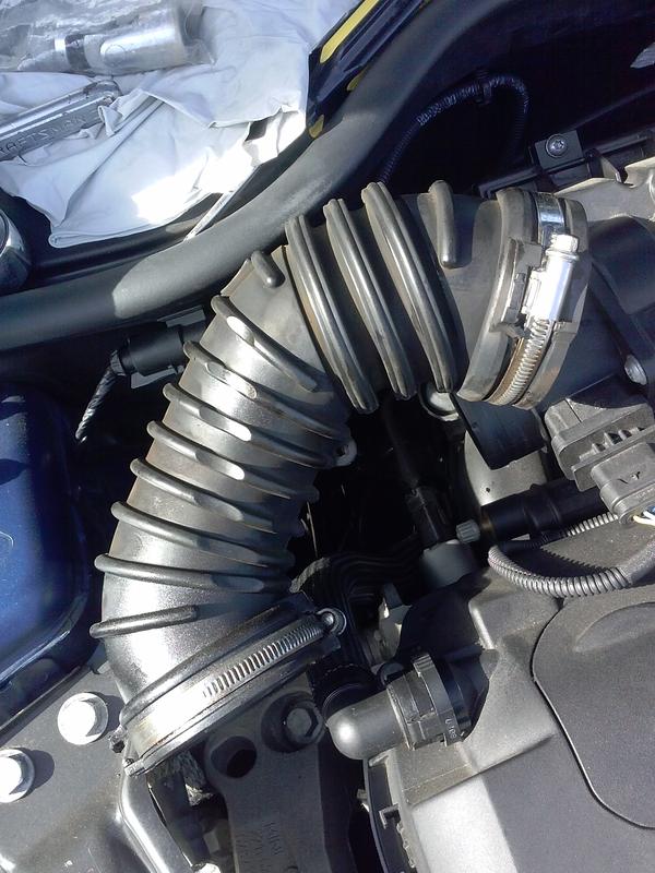 I first removed the rubber hose (just the top part), and moved it aside. Removed the metel vent (with 3 torq screws). I had full access to the Tensioner at that point.