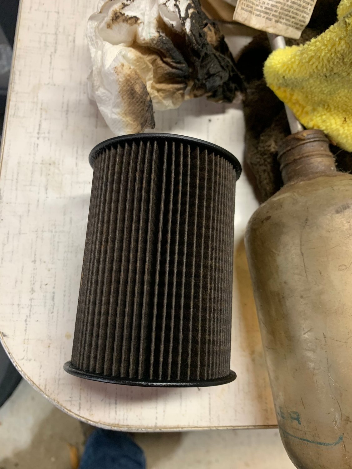 the fuel in the tank looks normal. Filter with 20k miles vs new filter Fuel from filter assembly Fuel in tank Fuel in filter assembly