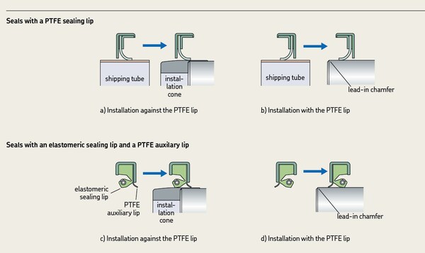 Therefore, special care must be taken during installation and handling to prevent damage and help ensure proper operation and function. Shaft features such as keyways and splines, as well as drill holes, ports and sharp-edged shaft steps have the potential to damage PTFE lips. Whenever possible, these obstructions can be covered by using thin-walled installation tools made from plastic or metal. PTFE lip orientation during installation will determine the installation method.