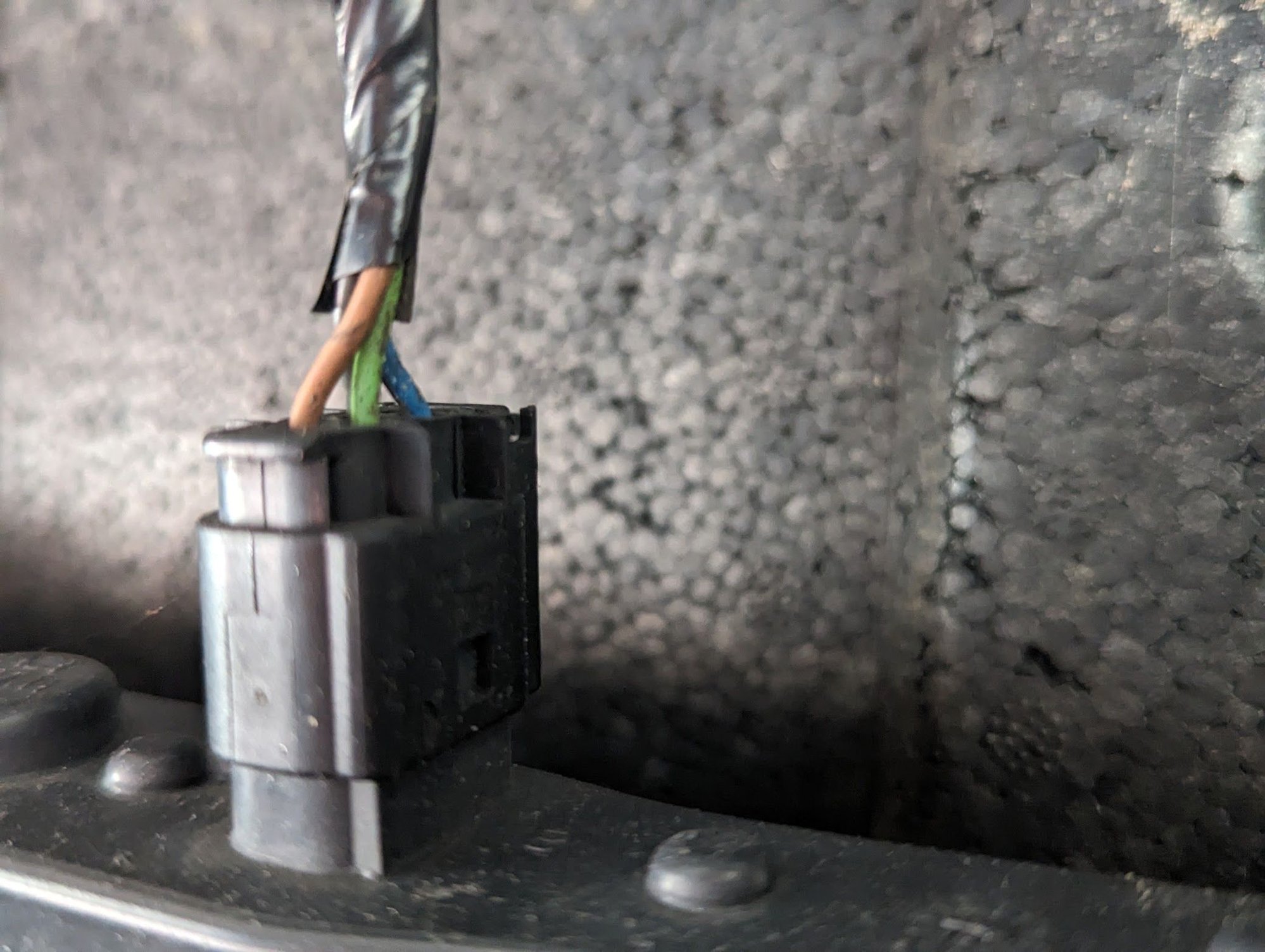 - I assume that brown is the ground, and the green and blue wires are the 12V+ for the reverse lamps and for the fog light (I haven't checked with a multimeter which one is the reverse yet).
