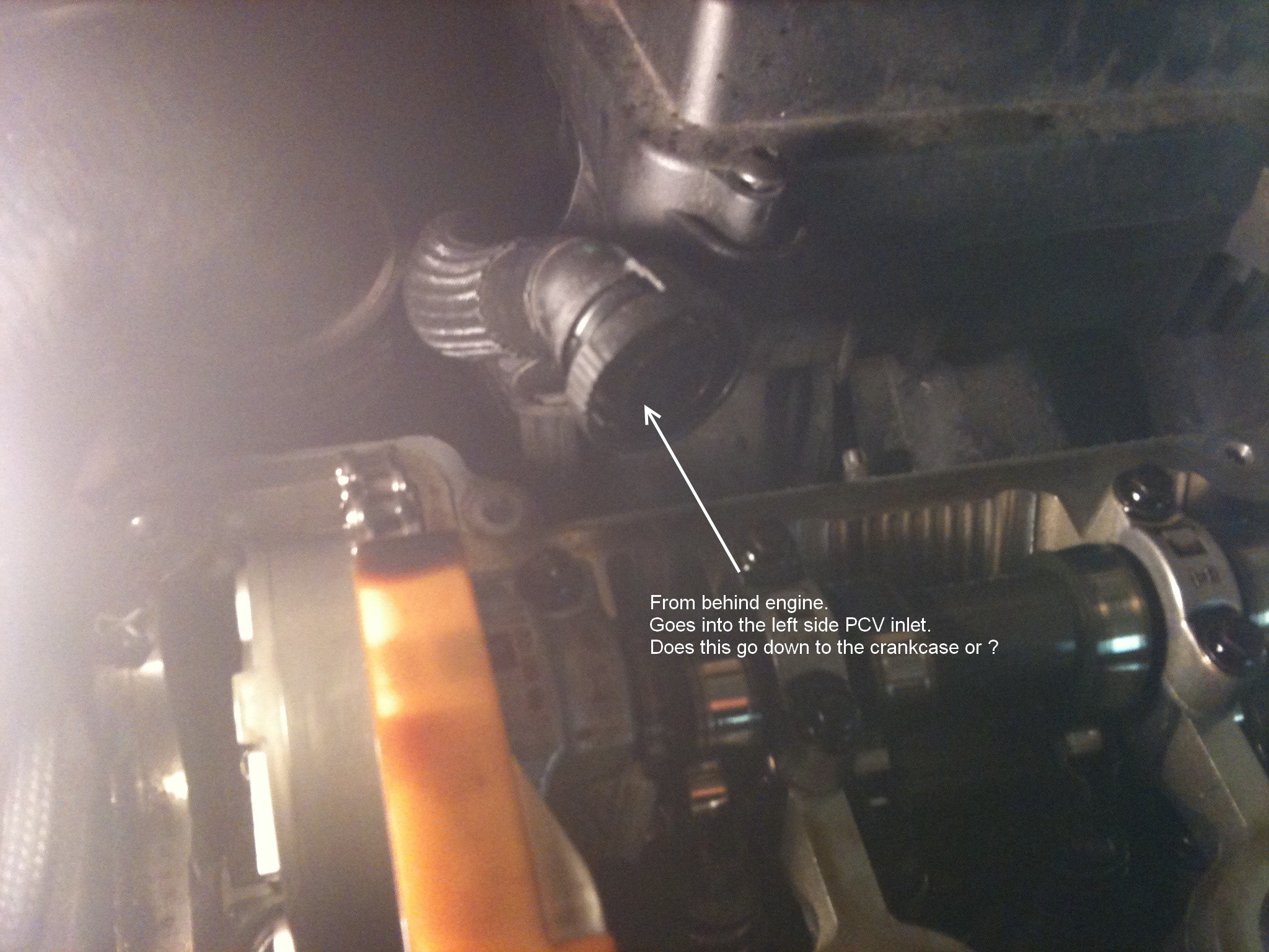 I think I understand the whole PCV valve thing. The left side PCV inlet comes from the crankcase I think and needs vacuum, the right side goes to the turbo inlet and provides vacuum, and there's a one way orange valve inside the valve cover. That one has me a bit mystified because it seems like it would suck air into the valve train when there's vacuum in the upper engine, Maybe when Accelerating/ decelerating?