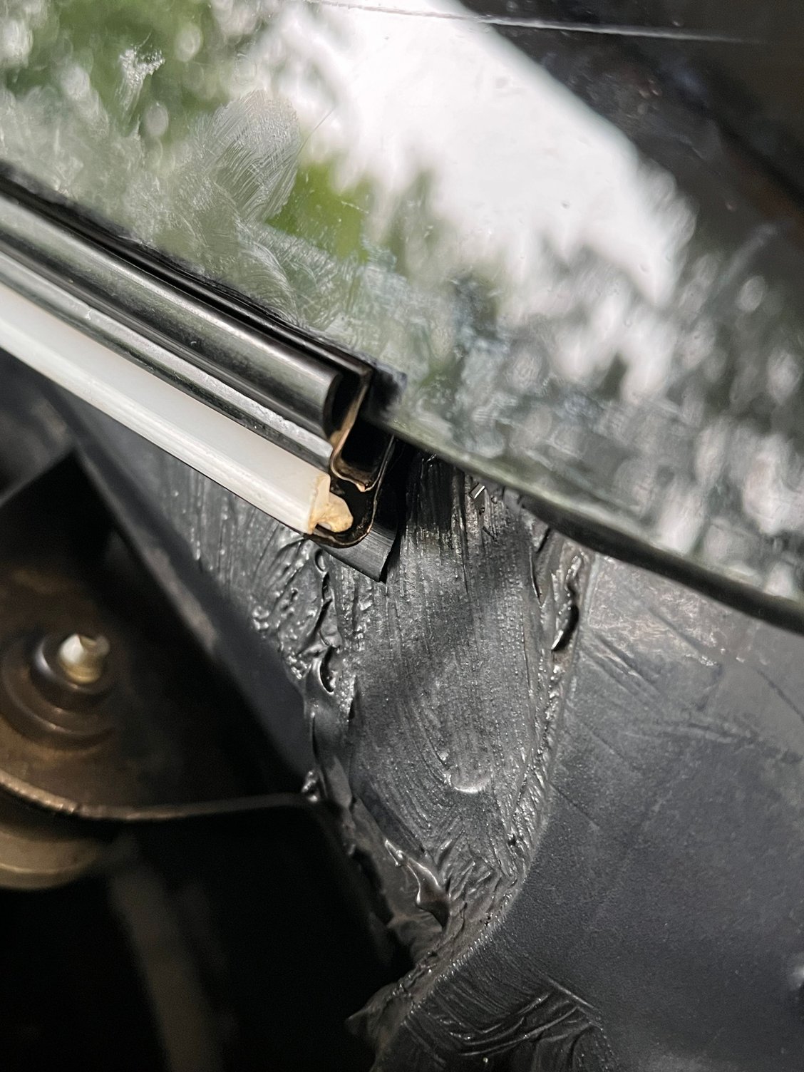The old strip had deteriorated, and came off the windshield when I removed the apron/cowl covers. I cleaned the surface of the glass with Windex. So far as I know it's the factory-installed original glass, and I don't see any adhesive where it looks like it shouldn't be.