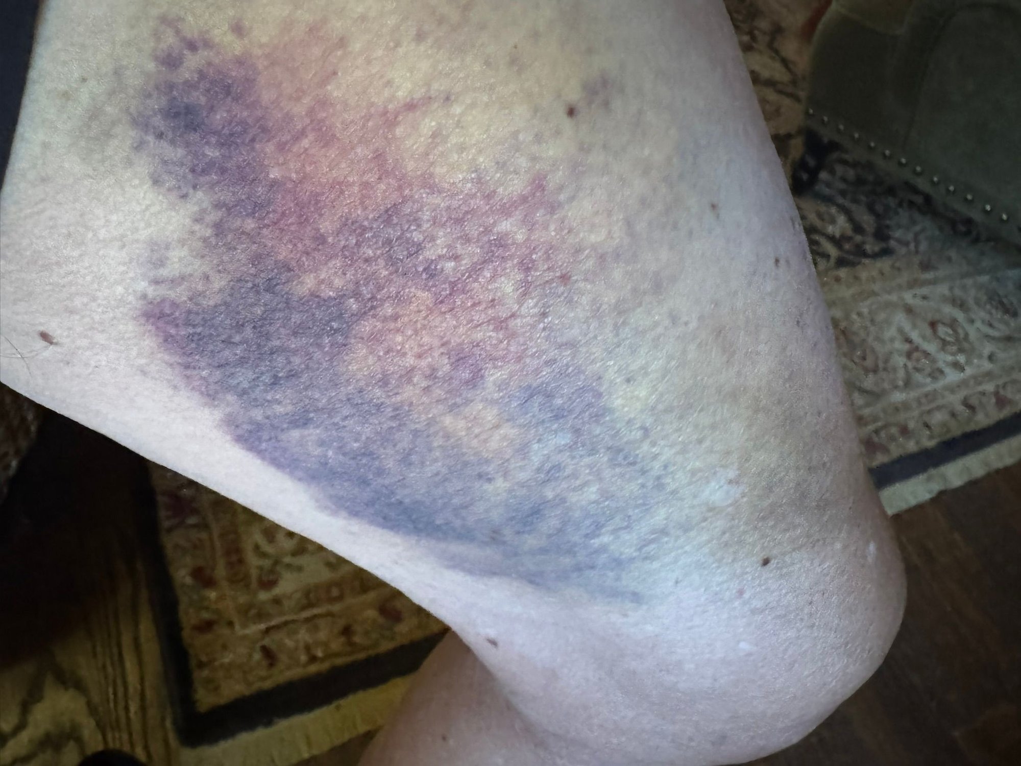 Continuation: Ended up replacing the brake master cylinder/reservoir, the clutch slave cylinder and finally the clutch master cylinder. Put everything back together and it bled properly. Drove to the service station Friday a week ago to fill up and a guy leaving the convenience store backed into the Mini and me at the same time. I had just closed the hood searching for any possible fluid leaks. Sent me flying into the driver's side rally light and headlight then over the hood (that was also dented where I hit it) and eventually landed about five feet from the car. Trashed the front of the MC40 and sent me in an ambulance to the ER cussing like a sailor because I thought my back was broken (check out that bruise on my thigh). I did not have that on my Bingo card that day. But that's another story for another time.