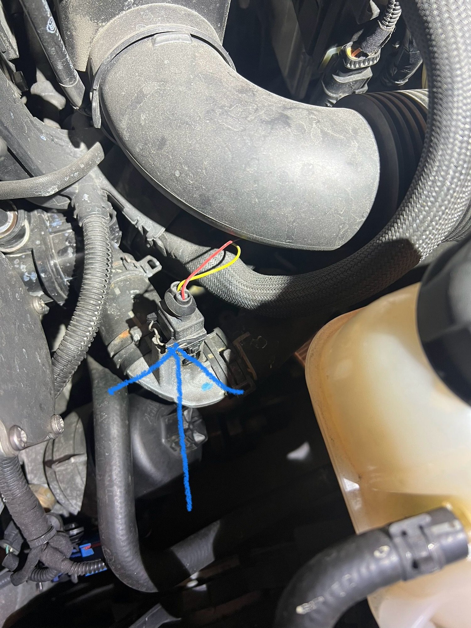 That is your coolant temp sensor. Unfortunately, there was a service bulletin back in the day that replaced it with a coolant hose and thermostat revision so they are no longer available. You can try pulling it and replacing the seal on it. But, the only other option would be to replace the hose and thermostat with the newer version, which isn’t a trivial task…