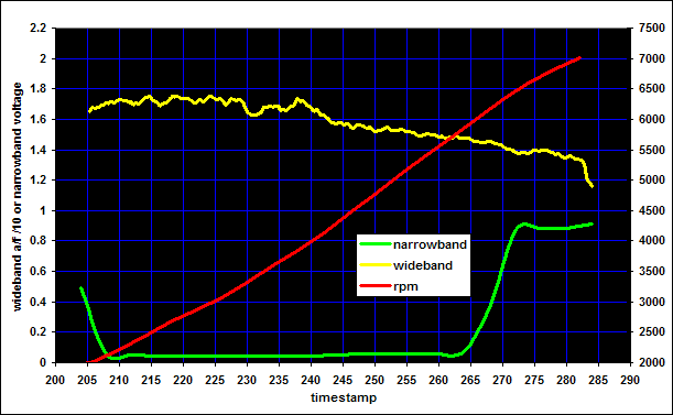 The second y-axis is RPM. The first y-axis is A/F ratio divided by 10 for the wideband. For example, at 5500 rpm the wideband shows about 15:1 A/F ratio. Meanwhile, the narrowband voltage at the same RPM is about 0.05 volts. What the graph shows is that even as A/F varies considerably (as the wideband shows), the narrowband hardly budges at all until it gets to about 14.7:1 where it swings wildly from close to zero volts to close to 1 volt. This chart shows how the only really useable information that a narrowband provides is whether the A/F is either higher or lower than stoichiometric.