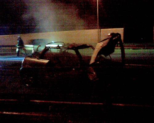 Last Monday, I lost my 06/2005 Mini Cooper S Convertible JCW. Driving in the middle lane doing 120 km/h (app 80 miles, max speed in the Netherlands) at 22.30h I suddenly heared a loud explosion sound on the front right side and I immediately lost all power. Steering to the shoulder, in the right lane I saw a flame coming out of the bonnet airintake hole. Oops. Drove immediately to the shoulder where I wanted to brake but the brakes totally failed.I stopped by using the handbrake and got out. Got back in twice to save some personal things (wasn't thinking by then...) while phoning the alarm nr. Fire dept was ther in 10 minutes but by then nothing was left of my 'pride-n-joy'.