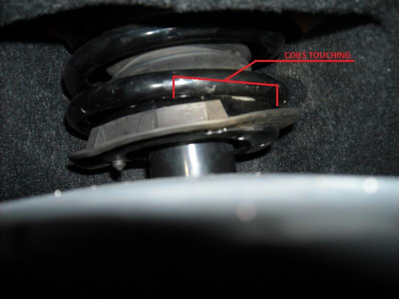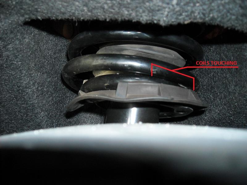 Here's my question for those of you out there with TSWs on OEM struts...when sitting static with all the car weight on the ground, do any of you have some touching of the bottom most coil wind to the second wind from the bottom on the front springs? Not talking about having it lifted on a jack where you can see the whole coil spring, I'm talking about looking at the spring through the wheel gap while the car is on the ground. I've attached a couple of pics at the bottom to show you what I mean.