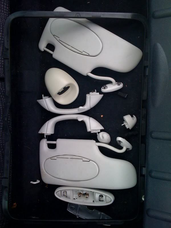 Use a Phillips head screwdriver to remove all the bits and pieces along the roof, including the grab handles, sun visors, and coat hooks, unplugging everything and fully removing it. When removing the sun visors, use a flat head screwdriver to pop off the plastic cover over the screws so you can remove them.